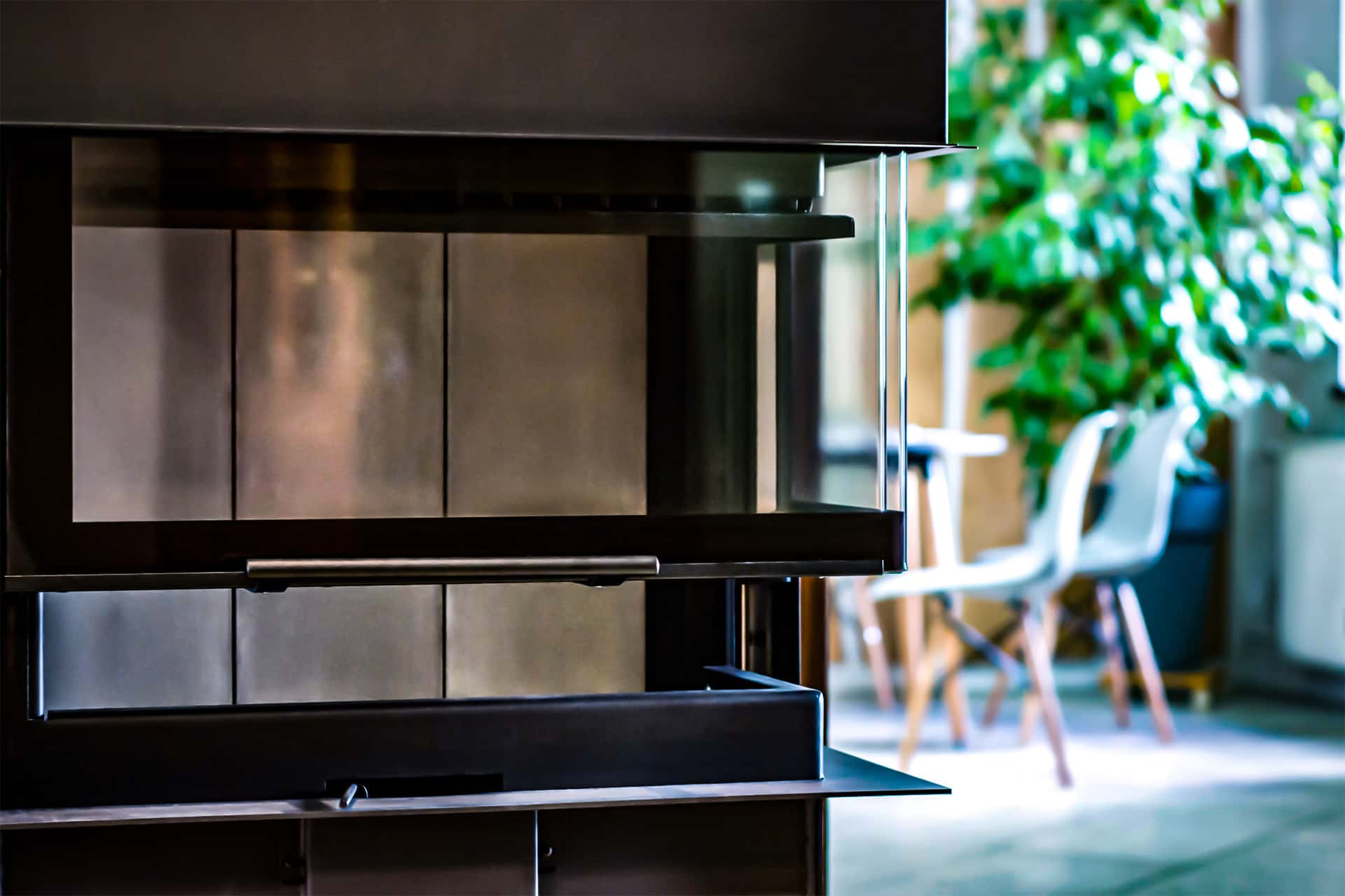 – net su trigubu stiklu. Priklausomai nuo židinio tipo ir naudotojo pageidavimų, tai suteikia keletą privalumų: pavyzdžiui, vandeniu kūrenamuose židiniuose daugiau šilumos energijos perduodama į vandens gaubtą ir tokiu būdu paskirstoma po visus namus per centrinio šildymo sistemą. Be to, visų tipų židiniuose optimizuojamas degimo procesas, nes degimo kameroje gali susidaryti aukštesnė temperatūra.Kartu su oro pritekėjimo sistema tai ilgiau išlaiko stiklą švarų ir apsaugo patalpą nuo perkaitimo. Taip pat sumažėja nuo židinio nudegimų rizika. Šios savybės skatina pastovų ir malonų šilumos tiekimą, ypač kai jis montuojamas su akumuliacinėmis medžiagomis.